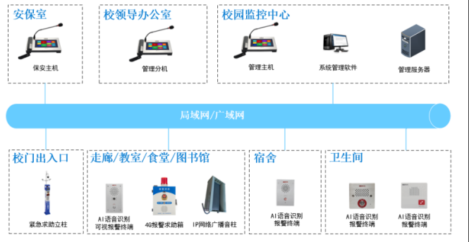 该解决方案能有效降低在宿舍和厕所等视频监控盲区学生欺凌现象的发生频率。同时在公共场所也能顺利获得我们的一键报警设备,进行主动式的求助,确保在任何情况下学生都可以进行报警并及时的获取到相关人员的帮助。顺利获得整套系统的部署,进一步健全校园的安防体系,学校及周边治安秩序有明显改善,各种治安案件明显下降,提高了校园的文化生活质量,营造安全、稳定、文明、有序的育人环境。